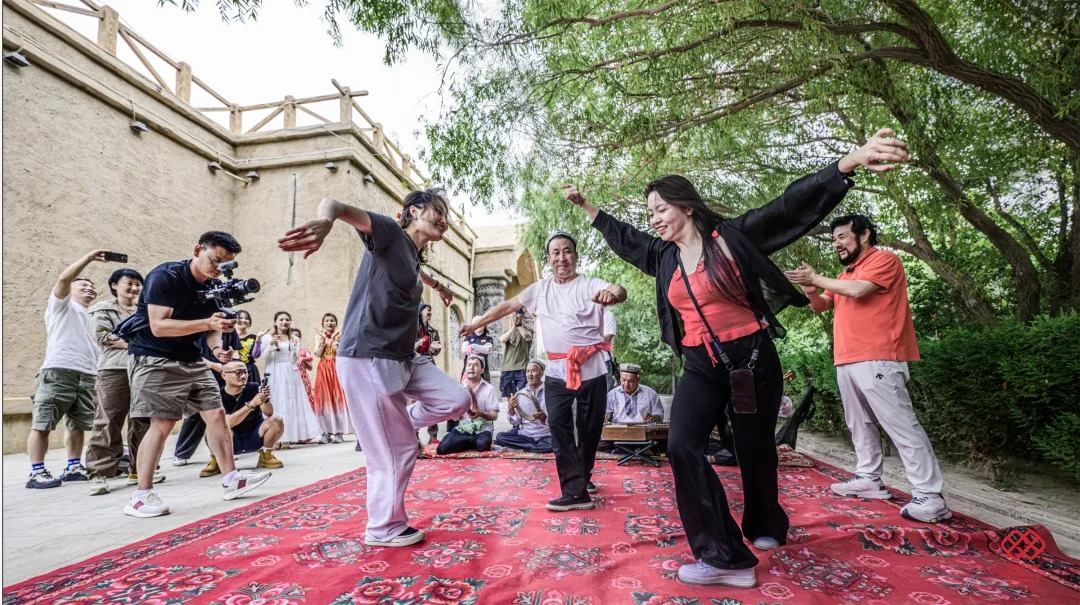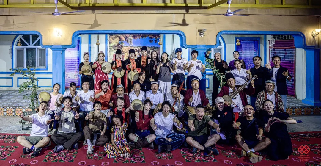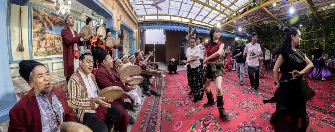 在民间艺人自家的院子里,在刀郎画乡的广场上,在吐鲁番文化馆中,质朴的当地农民和非遗传承人为采风团展示了特色鲜明的木卡姆表演。在麦盖提县的刀郎木卡姆活动中,采风团观摩了特色器乐表演和舞蹈表演,其中一位90多岁的非遗传承人亲自演奏。采风团跟民间艺人学习了舞蹈动作,并深刻感受和剖析了其与课堂教学中的区别与共性,体验刀郎文化的独特魅力。