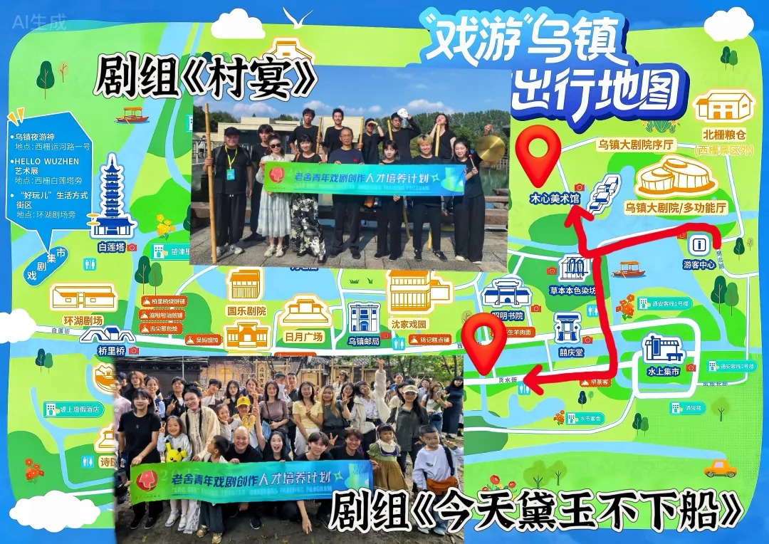 本次培训既是学习之旅,更是从创意到舞台的极限挑战。在剧本限时创作环节,经过构思、写作与投票,在导师团的精心指导下,两部剧本《今天黛玉不下船》《村宴》从文本走向排练场,登上第十二届乌镇戏剧节“嘉年华”单元的展演平台,累计吸引近千名观众驻足观看。