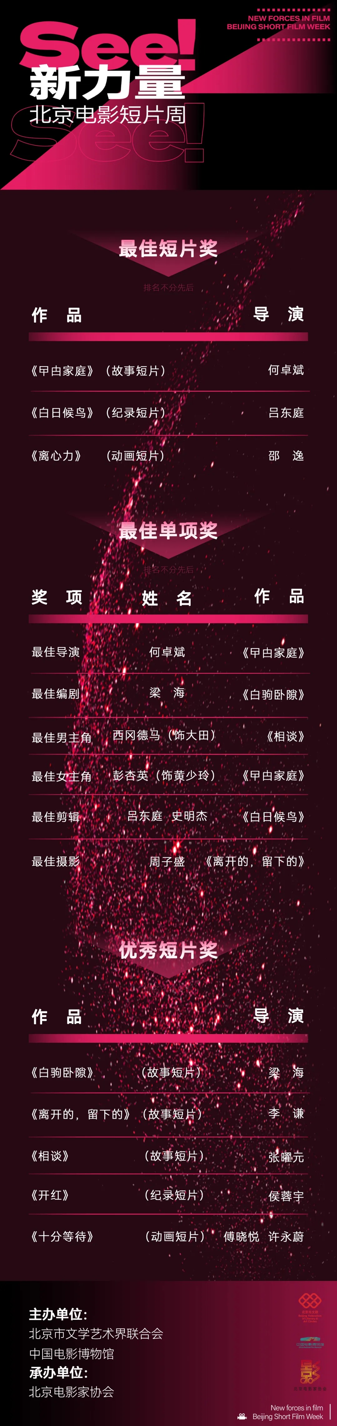 10月20日,由北京市文联与中国电影博物馆主办,北京电影家协会承办的“See·新力量”北京电影短片周颁奖活动在中国电影博物馆举行。活动揭晓了十大奖项,最终8部短片佳作摘得荣誉。佳作展映活动将于10月21日-22日在市文联老舍剧场举办,部分短片还将进行映后分享。