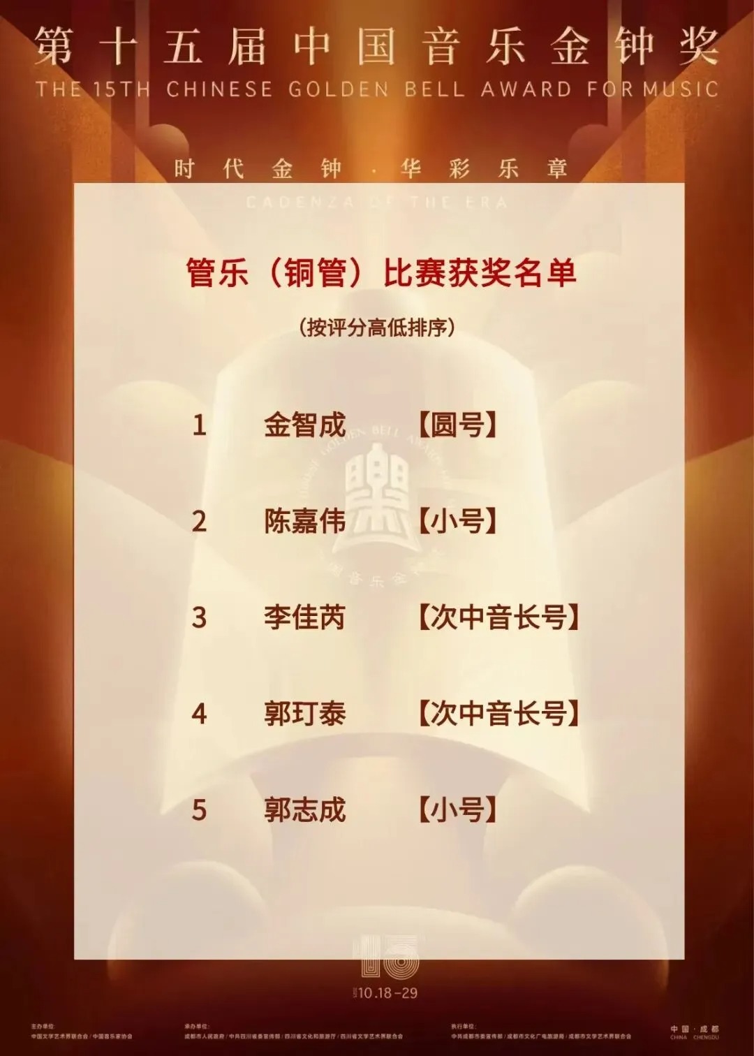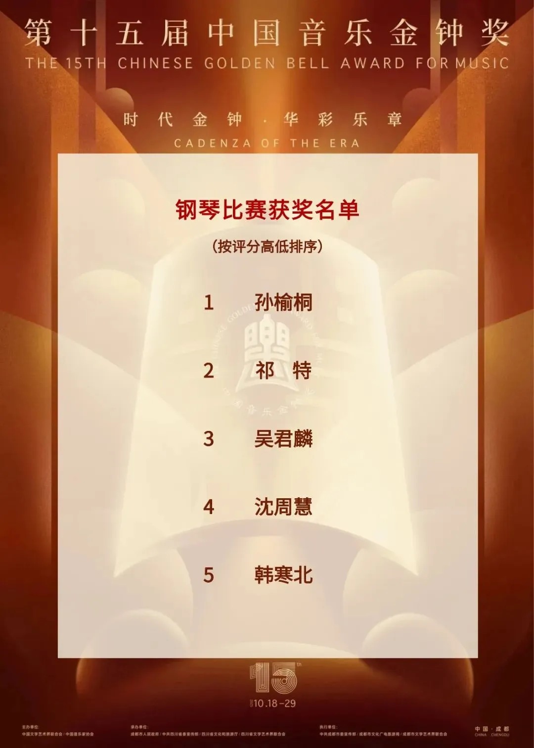 10月28日晚,第十五届中国音乐金钟奖决赛在成都城市音乐厅落下帷幕。由北京音乐家协会报送的铜管选手郭玎泰、钢琴选手韩寒北凭借出色表现,荣获本届金钟奖。15岁的韩寒北创造了金钟奖获奖年龄最小记录。北京音协也是全国音协系统中唯一敲响双钟的报送单位。